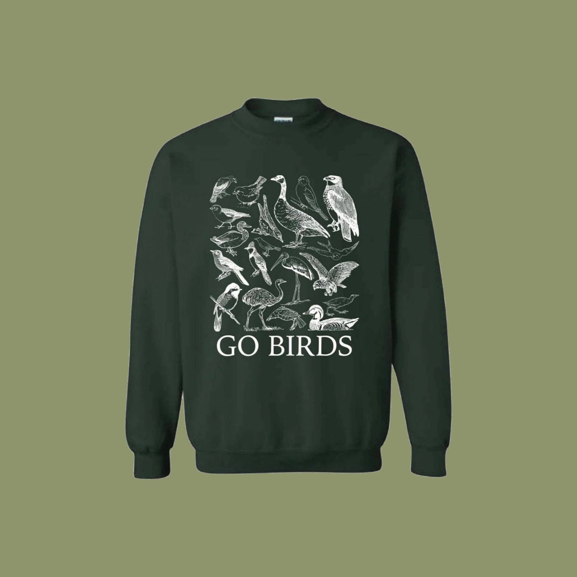 Go Birds crewneck sweatshirt featuring illustrations of real birds. Unisex Gildan 18000 Heavy Blend crewnecks with a screen printed design of bird illustrations that reads, "go birds" at the bottom. A perfect gift for any Eagles fan and/or bird lover. Model is wearing a size small.