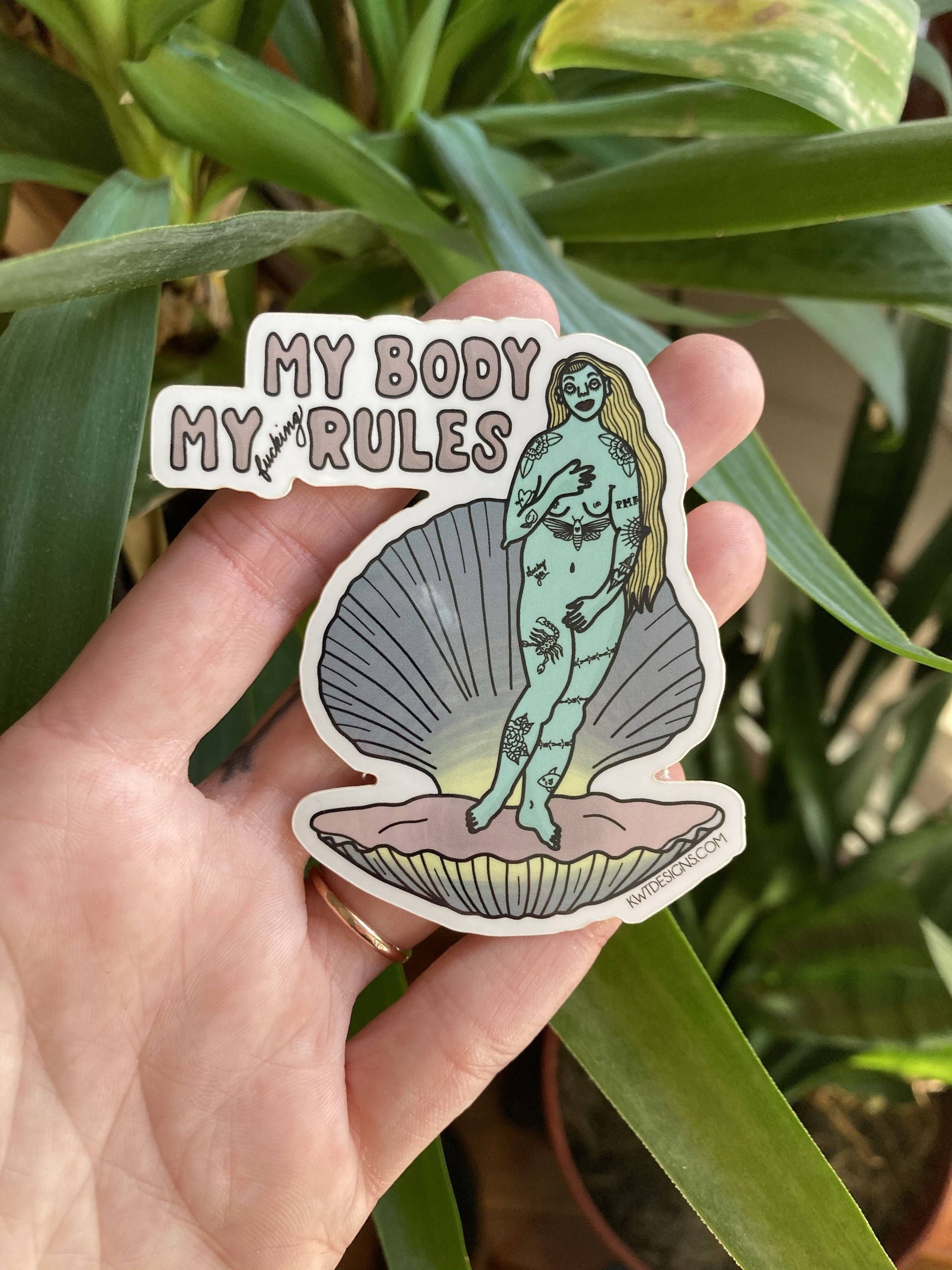 My body, my fucking rules This sticker measures 3" at its widest, is printed on glossy stock, and is weather resistant up to 3 years.